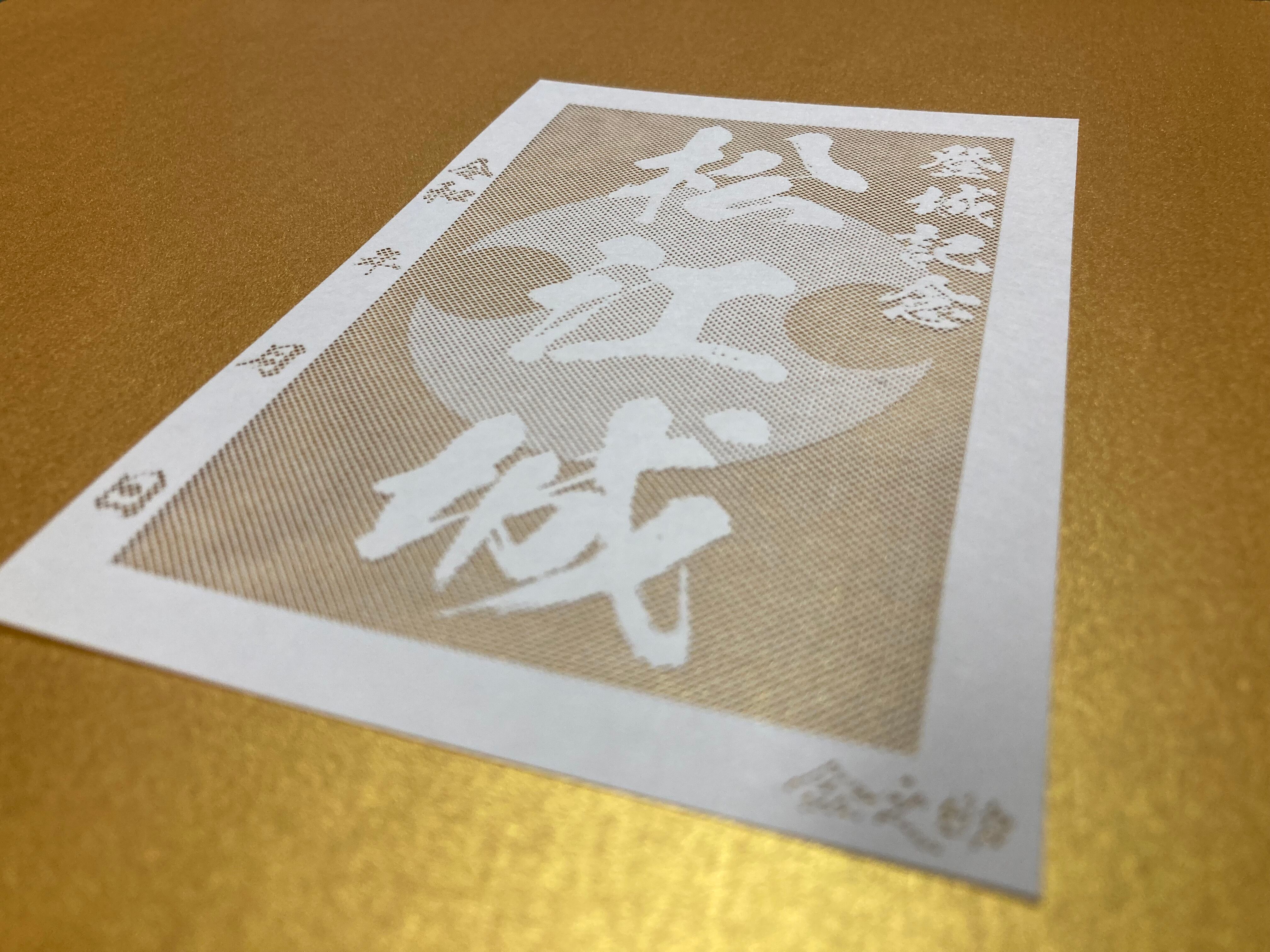 白色の和紙をレーザー加工だけで文字や家紋を表現した珍しい御城印になります。